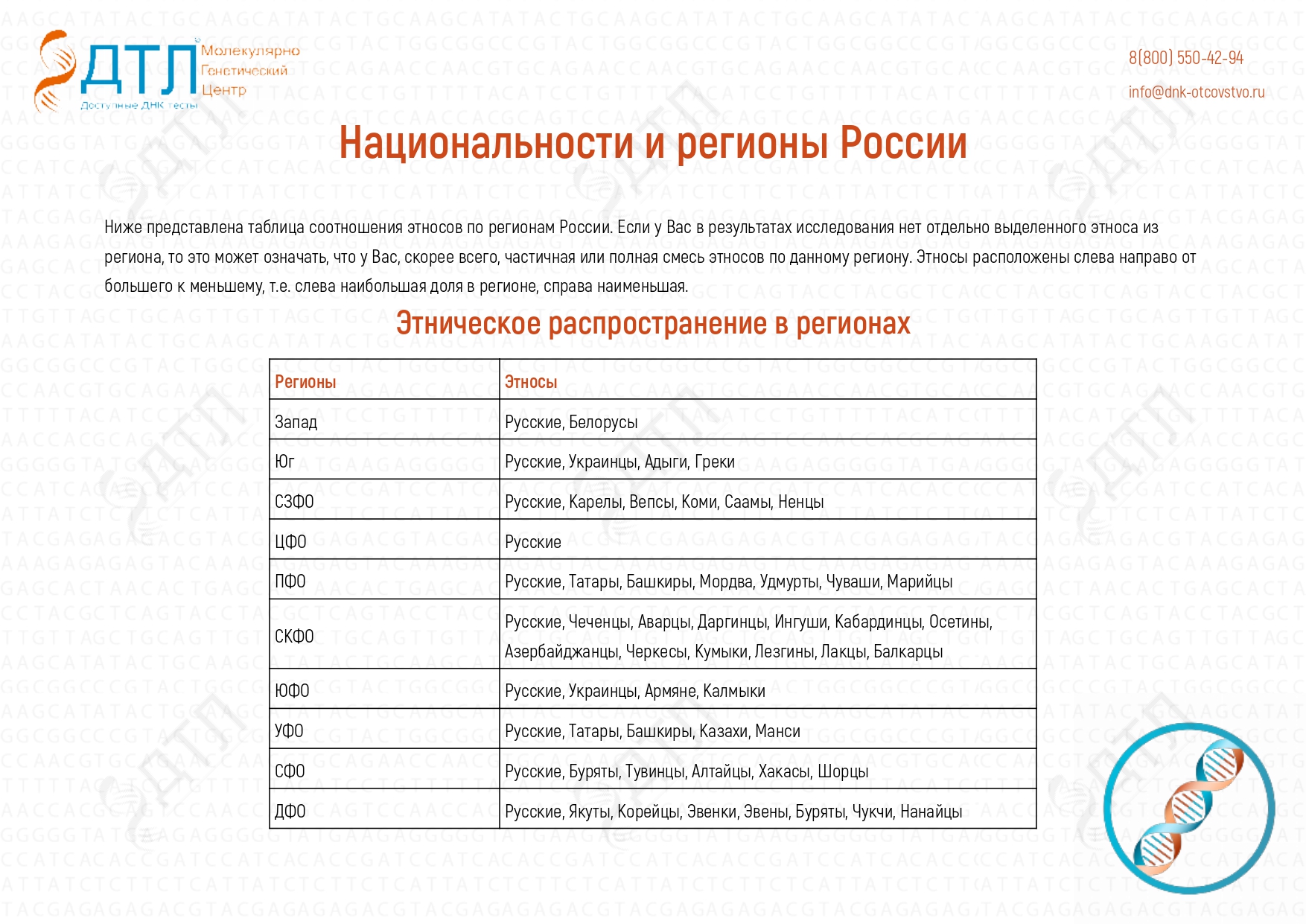 В нашем центре «ДТЛ» вы можете пройти ДНК анализ на национальность и узнать генеалогические корни. Возможно, среди ваших предков были евреи, карелы, осетины, молдаване, чеченцы, белорусы и многие другие.